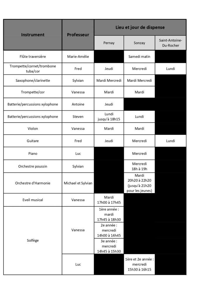 Vous trouverez ci-dessous le jour de dispense des cours pour la plupart des instruments.