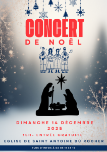 Concert de Noël église de Saint-Antoine-Du-Rocher Concert de Noël dans l’Eglise de Saint-Antoine-Du-Rocher à 15h00. + Ajouter à mon Agenda Google + iCal / Outlook export 00 jours 00 heures 00 minutes 00 secondes Date 14 Déc 25 Heure 15:00 - 17:00 Lieu Saint-Antoine-du-Rocher Saint-Antoine-du-Rocher Partagez cet événement